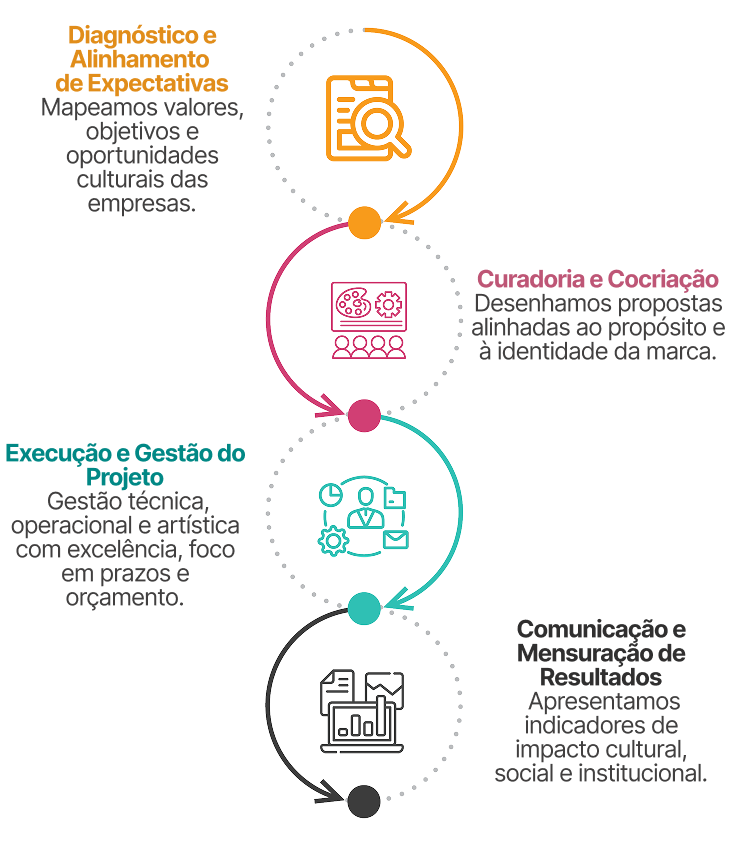 Desenvolvemos iniciativas culturais alinhadas à sua cultura organizacional e às metas de sustentabilidade, reputação e impacto social.